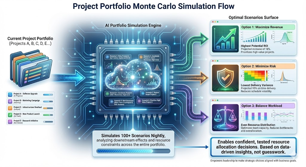 One of the most powerful applications of AI in project management is running “what-if” scenarios at a scale impossible for humans. A sophisticated AI system can simulate 100 or more different portfolio configurations every night. Scenarios like “what happens if we delay Project A by two weeks and shift three developers to Project B?” or “what if we accelerate Project C but accept a two-week slip on Projects D and E?”